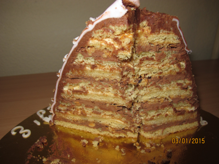 Взвесить торт я забыла, но примерно 2,5 - 2,7 кг. Внутри сделала песочные коржи плюс крем шоколадный с фундуком и крем-брюле. под катом разрез: