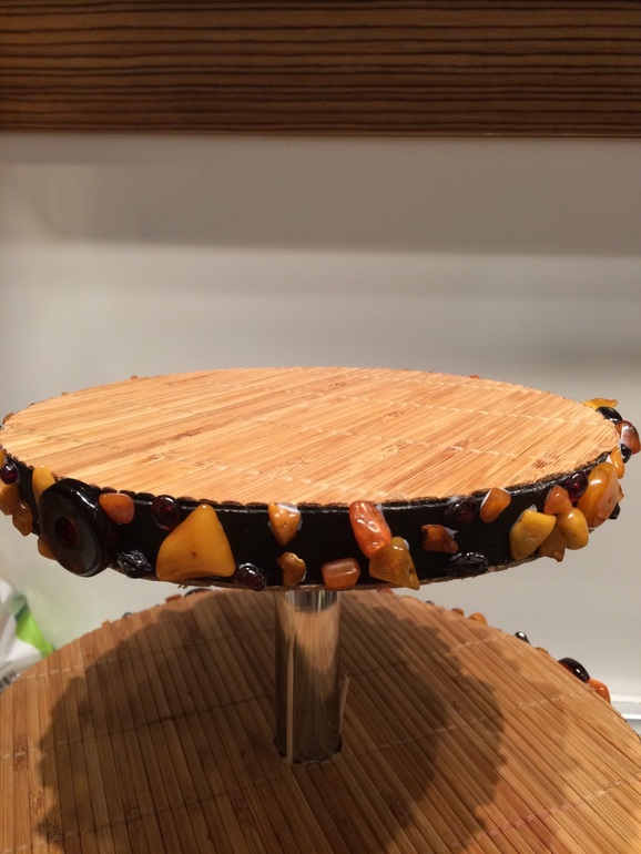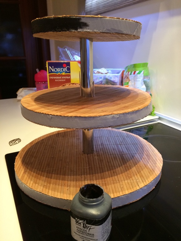 Ярусы фиксировала на жидкие гвозди прозрачные, и втискивала зубочистки для прочности. Еще не экспериментировала с возможным весом(собираюсь ставить капики и не большие по диаметру тортики), но верхний и нижний ярус, могут выдержать много )))) каждый диск сажала на бамбуковую подложку с двух сторон и тоже на гвозди! А они, как показывает практика, дают прочность)