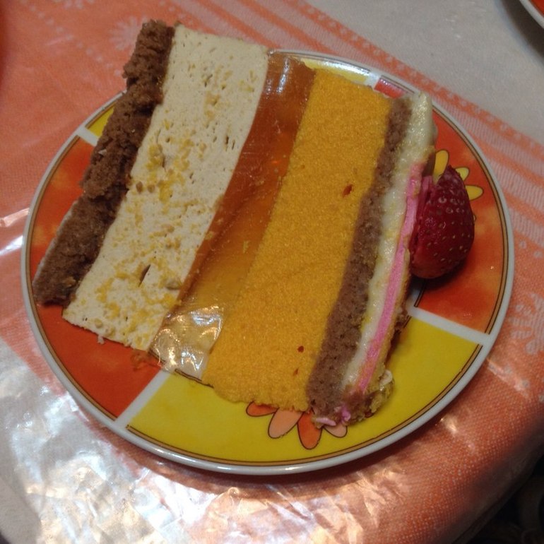 Бисквит, кофейный и морковно-апельсиновый мусс, апельсиновое желе.