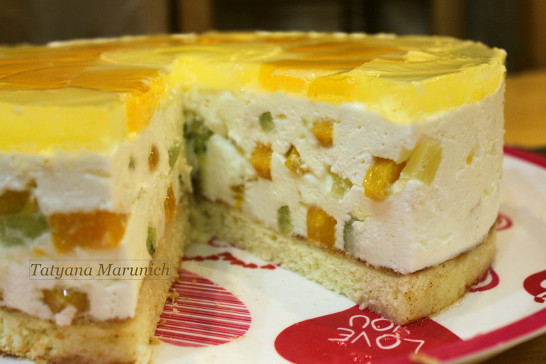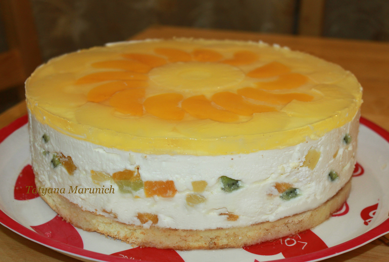 Это не творожный только.Бисквит, пропитанный персиковым сиропом, нежное суфле(как на птичку) с кусочками персиков, ананасов и киви.(фрукты можно любые) Сверху фрукты в желе.