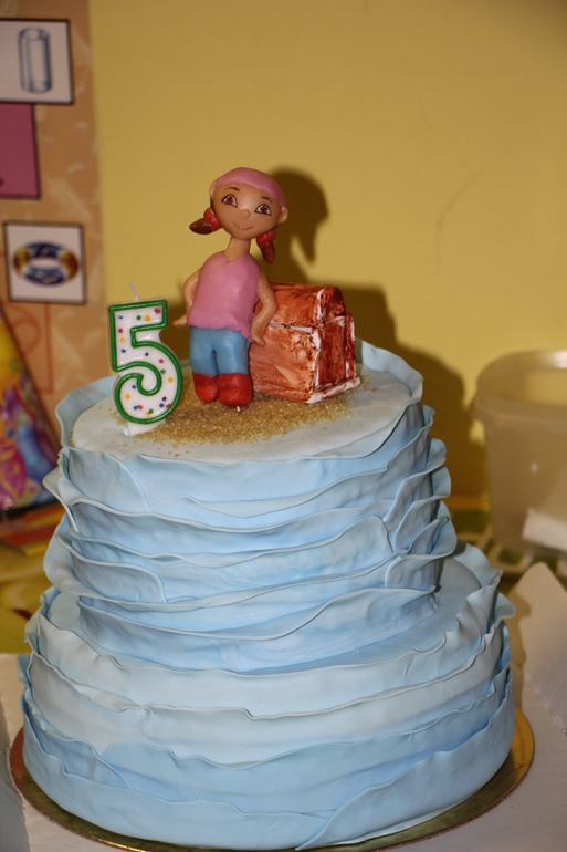 Вот такой торт у меня получился для дня рождения дочки, низ ванильный бисквит с маскарпоне и клубникой, верх три шоколада от Луки Монтерсино (все гости в восторге, очень вкусно) Попытка слепить Иззи из "Пиранов Нетландии" не очень то удалась, хотя дети ее узнали. Нужно набивать руку для работы с моделом, все время у меня таял, и фигурка получилась в белых жирных подтеках((( Покосился немножко.
