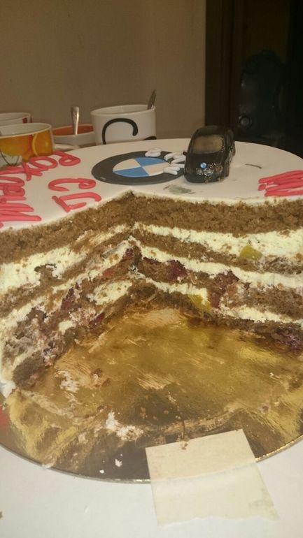 Торты для мужчинПочти 3 кг. Внутри шокошифон, сливочно-творожный крем, персики, вишня.