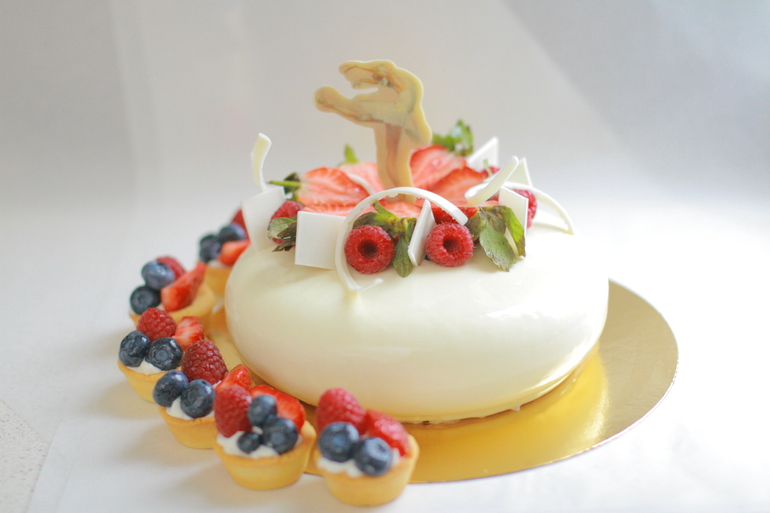 Любимый "Ежевичный чизкейк", зеркальная глазурь, ягоды и шоколадная балерина. И ягодные мини-тарталетки с кремом патисьер с ванилью и ягодами.