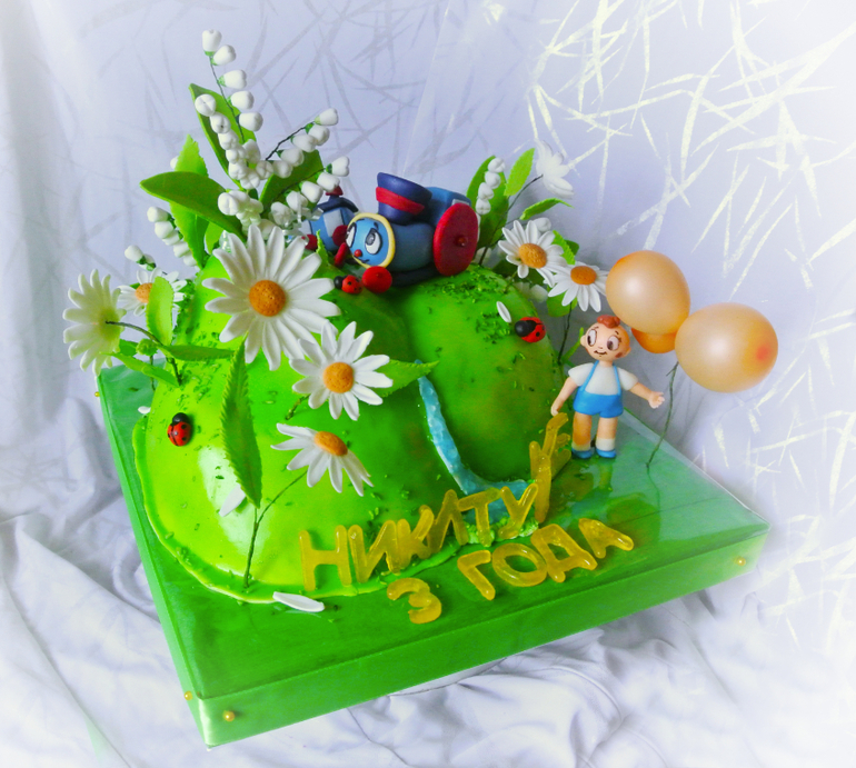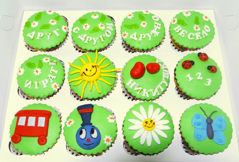 Торты детскиеТортик и капкейки к нему. Вес чуть больше трех кг. Внутри два вида торта: шоколадный с вишней и коньком для взрослых и творожный с персиками для деток. В капах абрикосовое варенье.