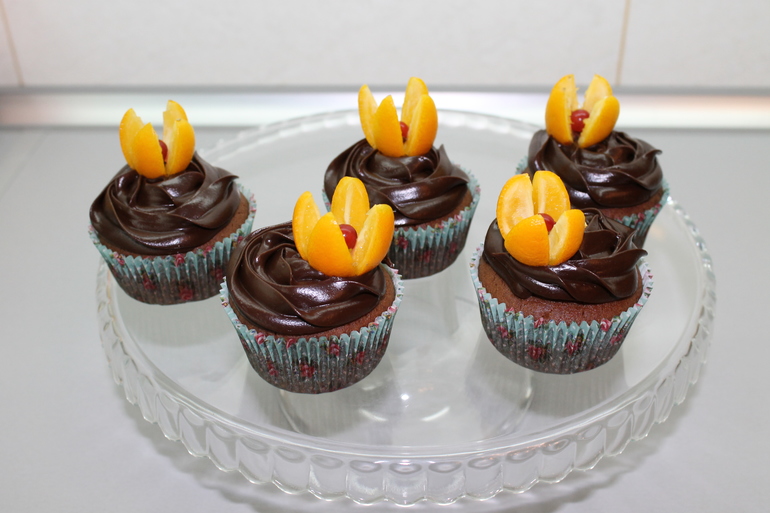 Шоколадные капкейки с апельсиновым ганашем, сверху крем-ганаш из темного шоколада