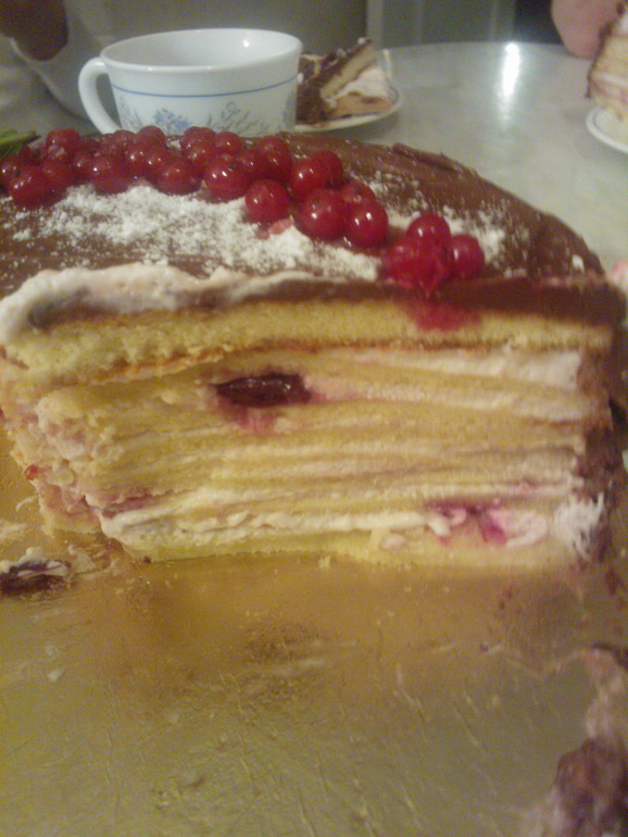 Торты для домашних и друзейПосле двух суток изготовления двух тортов настало время из остатков и получившихся некрасивых коржей собрать торт своим))). Всеми любимая "Молочная девочка" у меня не получилась для заказного торта 26 см диаметр, коржи не поднимались, края очень тонкие ломались. Оставила, испекла другие. Пришло время и им)) обрезала под 22 диаметр, пропитала сиропом, крем йогуртово-сливочный с вишней, покрытый ганашем с добавлением сливочного масла. Испробовала новый инструмент -гребенку, торец тортика, не видно на фото)