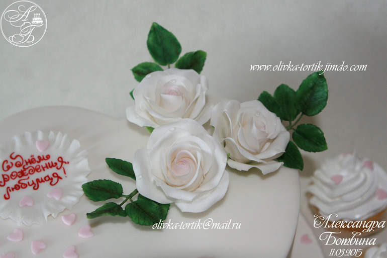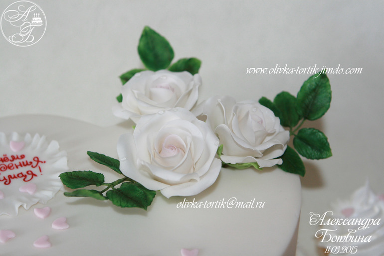 Просто потрясающая красота!!!! Подскажите, пожалуйста, а вы розочки и листочки из какой мастики делали? (Это же мастика?). И как лепесточки прикрепляли друг к другу? Я просто только-только начинаю творить и вот как раз сегодня пыталась сваять розы из самодельной мастики из маршмелоу - и как-то не очень получилось. Понятное дело, что руки из одного места, но все же может я выбрала не тот материал....
