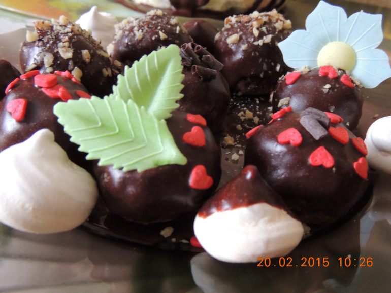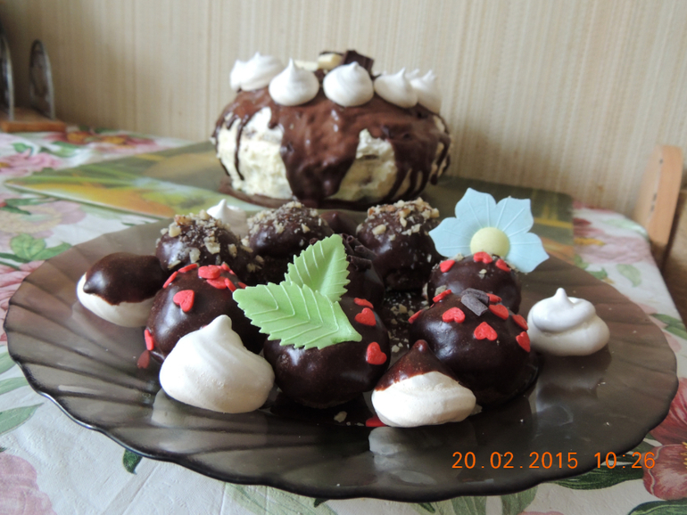 Сделала обычный бисквит,крем со сливочно-творожным сыром и сливками,каждый слой посыпала орехами и украсила ганашем и шоколадом с беzе.на вкус получился что-то типо панчо,короче говоря очень вкусно. еще делала конфетки