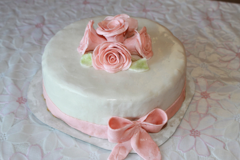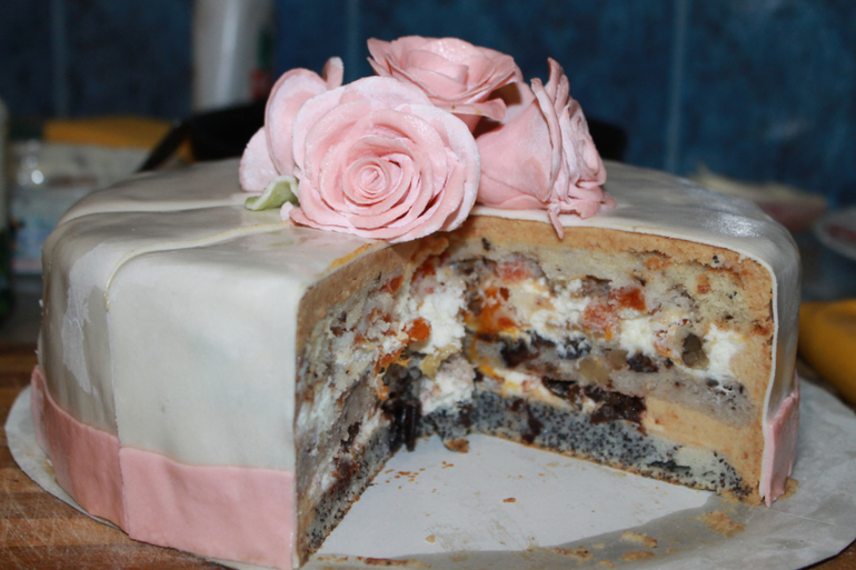 Взяла за основу Торт "СКАЗКА" от NAVAHA (Елены с ББ), испекла три коржа и промазала их сливочно-творожным кремом с фруктами и оставила на пропитку на ночь. А сегодня начала заниматься оформлением. Очень сложная это конечно работа, ничего не скажешь! В итоге к вечеру тортик готов, пришли гости и оценили мою работу на отлично))) Конечно знаю, что до отлично мне еще как до Китая, но если учесть что это мой первенец, то, нарываюсь на похвалу)))) в процессе работы поняла несколько ошибок. Обтянуть торт идеально не получилось, во-первых основа была далека от идеальной, инструмента вообще у меня нет, и даже линейки в доме не нашлось (деревянную я пожалела), а во-вторых мастики белой было впритык. Потому получились складочки, но я немного их замаскировала ленточкой. Еще с красителями беда! Заказала в интернете только на днях. Строго не судите, любым советам буду рада! В общем девочки спасибо вам огромное за вдохновение!