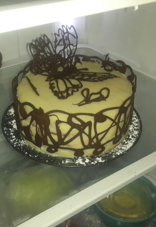 никогда не фотографируйте торт на таком фоне — это не аппетитно. и делайте шоколенту через мЕньшее отверстие, чем это — тогда шоколад ляжет красивее и не будет таких заборообразных дырявых промежутков. с шоколадом нужно тоже учиться работать — капризный товарищ