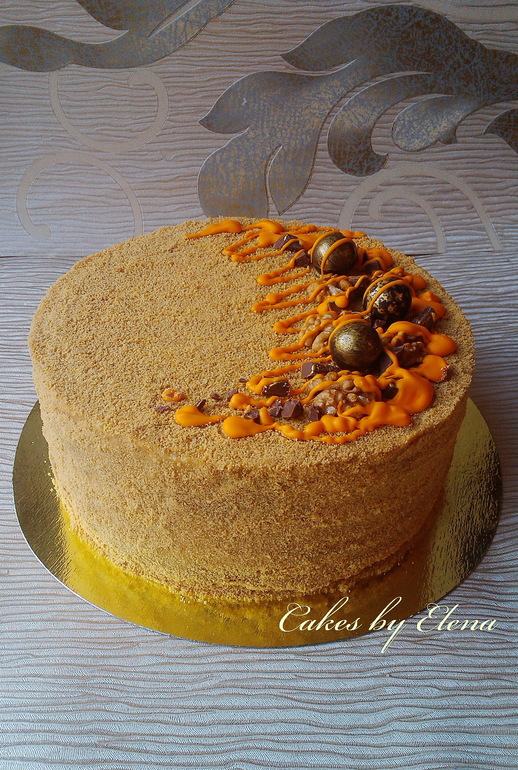 Попробовала оформить шоколадом и конфетами. Внутри медовый бисквит с грецким орехом, крем-брюле и карамелизованный банан.