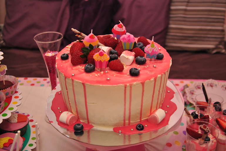 - ну и конечно же тортик - ванильный шифоновый бисквит (из которого я сделала розовую зебру), творожно-йогуртовый крем, вишня, украшенный ганашем из белого шоколада и свежими ягодами, политый шоколадной глазурью