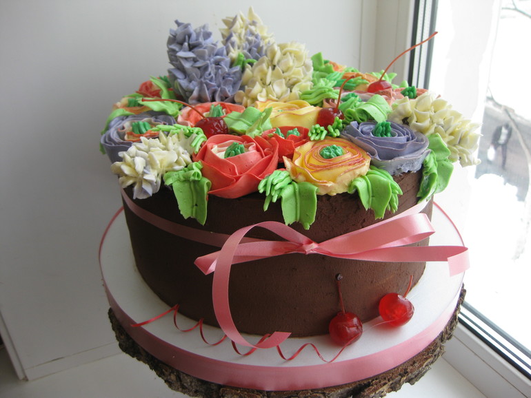 Очень хороший торт.. жаль не очень хорошо видно, но всё равно достаточно, чтоб сказать — хорошая работа. Только у меня вопрос — что с листьями? вы их специально "повесили"? и второе — форма листочков. Крема не хватало? я сейчас не придираюсь, ей богу)) честно-причестно.. просто и торт и декор очень и очень не плохо сделаны, а листья в глаза бросились. Предполагать, что вы ещё только учитесь не логично — остальное сделано качественно. при таком навыке как я вижу, для "косяков" с листьями должна быть иная причина. Ещё раз прошу извинить моё любопытство, а это именно оно, а не критика))