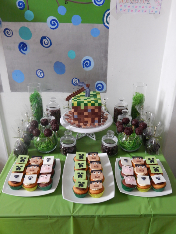 Первый раз делала сладкий стол )) игра "Майнкрафт". Торт 3 кг йогуртовый мусс с клубникой, капкейки ванильные с клубникой и сырным кремом, шоколадные кейкпопсы, яблоки в карамели + изюм в шоколаде, мармелад и шоколадные шарики.