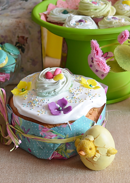 3. Европейский классический Пасхальный кекс, с большим добавлением цукатов и сухофруктов, покрытый белковой глазурью. Украшаю цветной кондитерской посыпкой и авторским декором из мастики (не фигурки, мелкие детали).