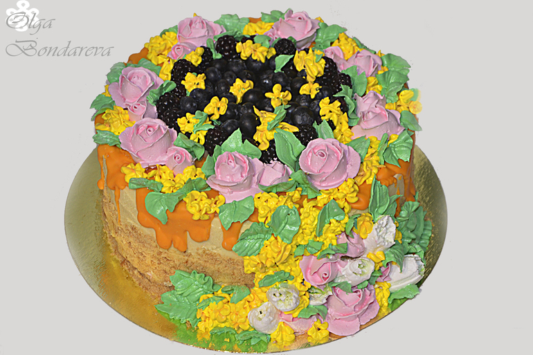 Торты для домашних и друзейТорт для моего любимого мужа в честь дня рождения:) Почти 4 кг без малого -Рыжик с чередованием карамельного крема и сливочно-сметанного с вареной сгущенкой, тончайшей прослойкой из хрустящего слоя, оформлен апельсиновым шоколадом, выравние-крем Шарлотт, украшен белковым заварным кремом и сладкими ягодами.