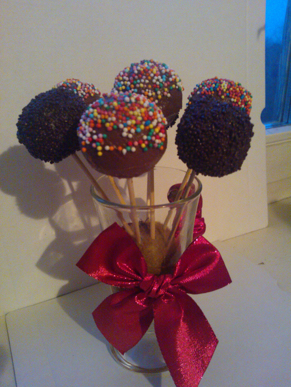 Кейкпопсы из остатков коржей "молочной девочки" (от торта с зайцем) -катала из того что осталось -коржи, сахарный сироп, ганаш с растопленным слив.маслом, глазурь делала молочную с какао. Шоколадные шарики-посыпки сестра привезла из Питерского музея шоколада))