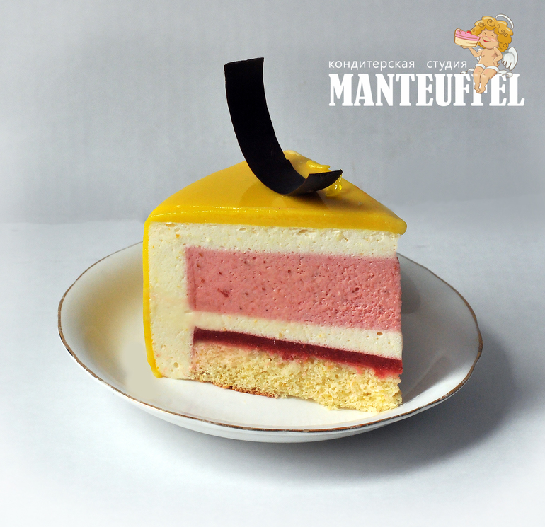 Лимонный бисквит, клубничное желе, клубничный и лимонный муссы.