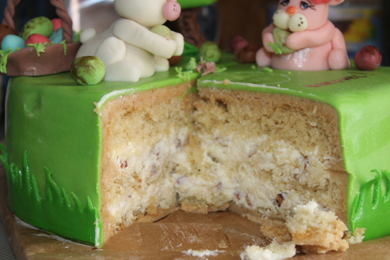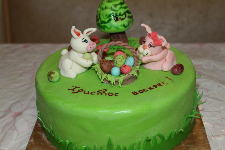Проба пераДевочки, выставляю на ваш суд второй мой тортик.В этот раз работала с молочной мастикой. Для обтяжки действительно очень здорово. А вот лепить все таки из нее мне не понравилось. Мои кролики пасхальные больше на хрюшек похожи))) Домашние сказали, что это очень очень отожравшиеся кролики)))) Начинка "Рафаэлло"