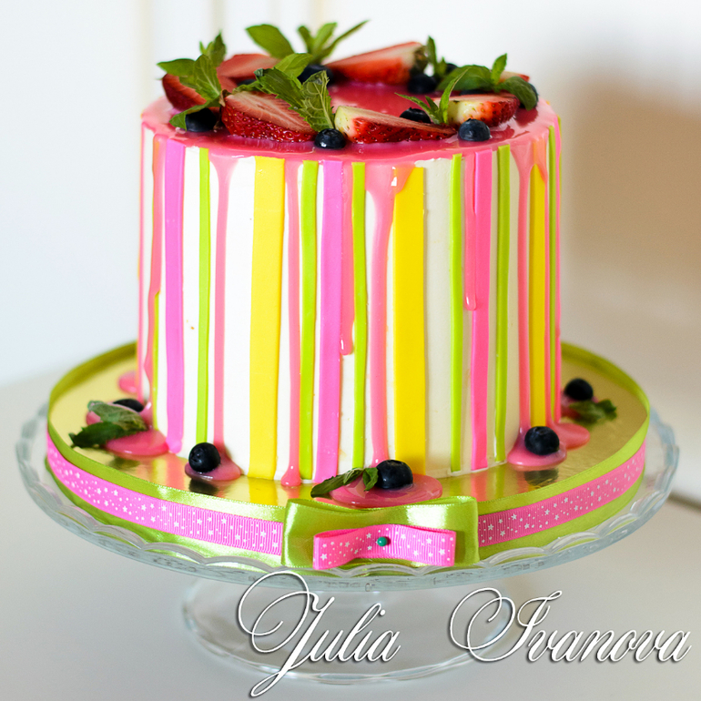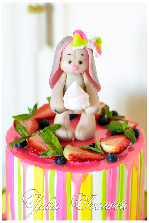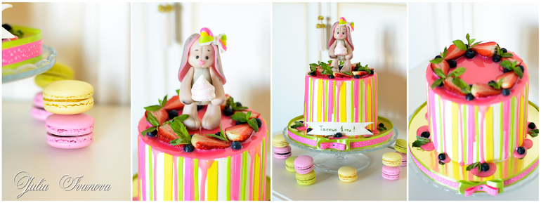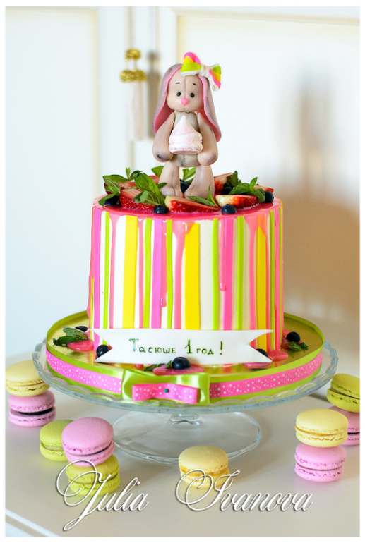 Украшение тортов кремом,шоколадом, фруктамиЭто был срочный заказ для Светик! Хочу сказать ей спасибо за то, что доверилась мне)) Тортик безмастичный. Из мастики только полосочки на боковинках. Фигурка зайки из марципана. В комплекте с тортом шли еще и макаронс. Цветовое решение и дизайн был отчасти продиктован нарядом именинницы и общей атмосферой праздника!