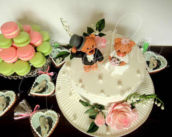Торты свадебныеВот таким небольшим (3 кг) тортиком, открываю свадебный сезон 2015))). Внутри "Клубничный поцелуй". К тортику еще прилагаются макароны и пряничные сердечки с фотопечатью на сах. бумаге. Торт сделать по присланной заказчиком фотографии торта Оленьки Надышневой, спасибо ей за идею)