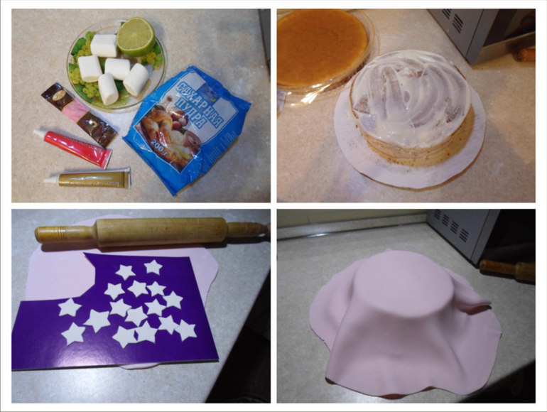 обтяжка мастикой (самодельная с клубничным сиропом, всем понравилась, очень необычная получилась на вкус как помадка у конфет)