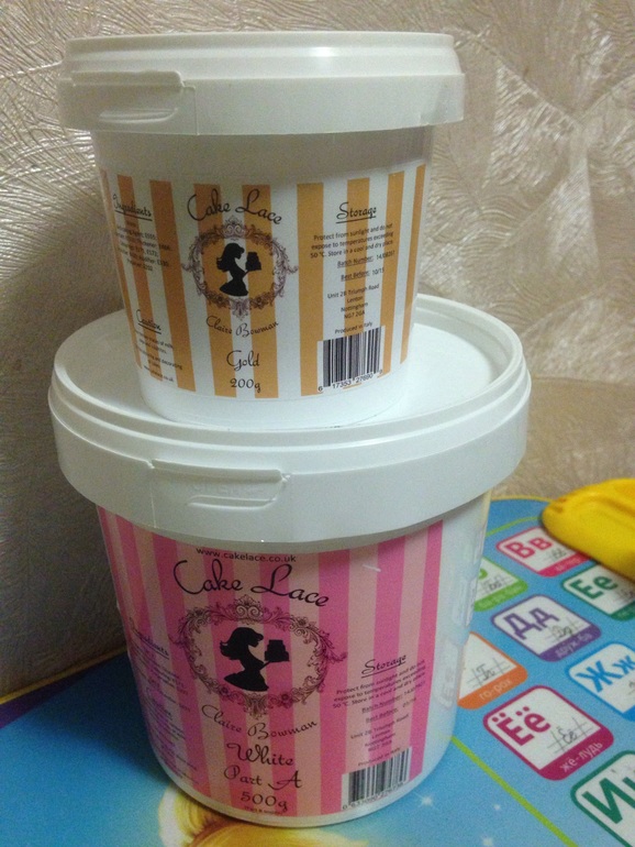 4 cт л части А и 50 мл холодной воды поместить в миксер и взбивать в течение 2 мин... добавить 0,5 чл части B... взбивать еще 4-5 мин... аккуратно распределить по коврику, удалив все лишнее.. оставить на воздухе на 3 часа или же в духовке на 15 мин при температуре 80 гр Цельсия... кружева крепятся к торту на холодную воду... их можно приготовить заранее и хранить месяцами просто завернутыми в кальку.. золото готовое, прямо на коврик. У меня оно быстрее сохнет, чем белый почему-то...