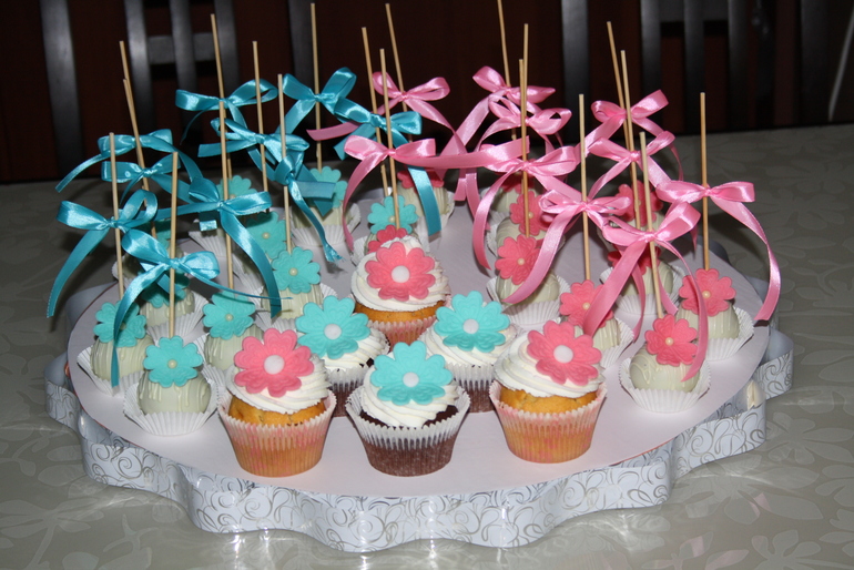 Капкейки и КейкпопсыСвадебный мини сладкий стол. Кейкпопсы шоколадные и ванильные, капкейки так же шоколадные и ванильные с кремом чиз.