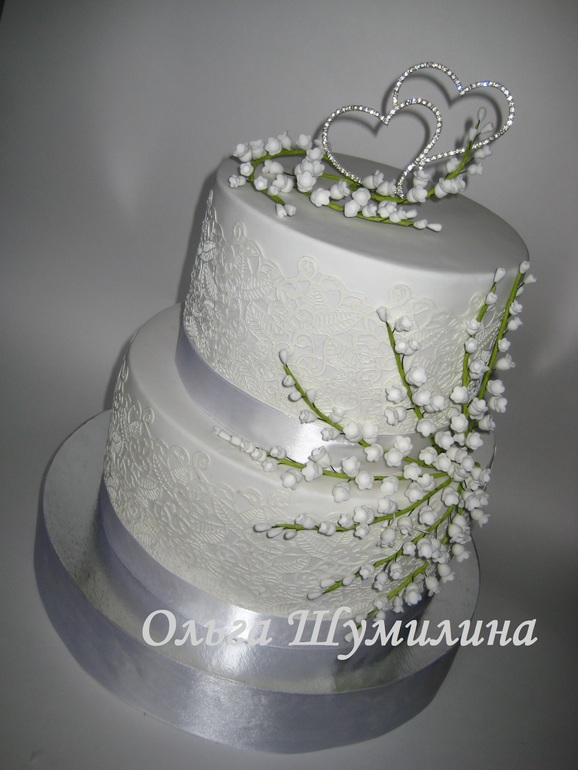 super_smilies082.gif очаровательный тортик, сама нежность и ландыши оригинальны на торте. Буду неоригинальной ваши кружева меня поразили, если можно рецептик попросить, с форума самовара вообще ничего не получилось(((