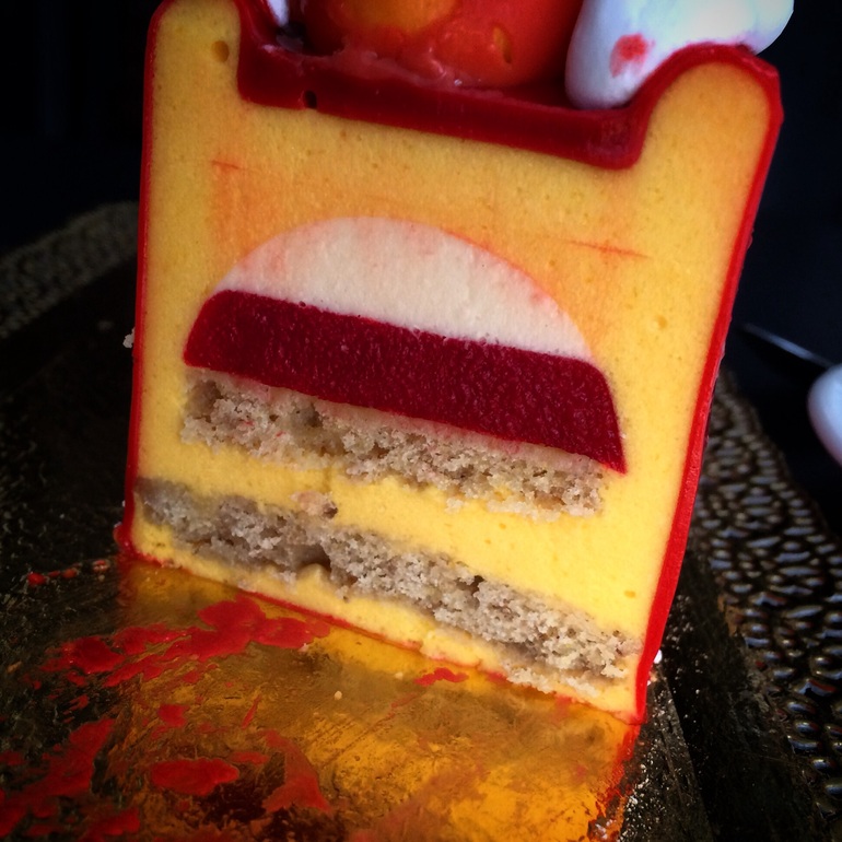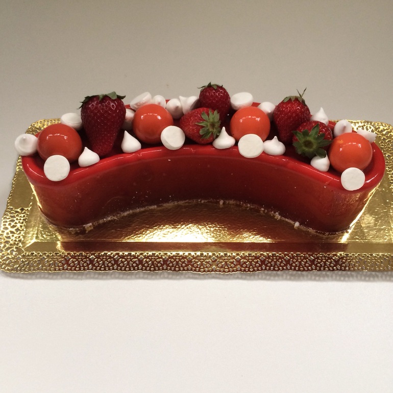 Разрез одинаковый по всей длинне торта, часть с кули-крем-бисквит внутри имеет такую же изогнутую форму, как и сам торт