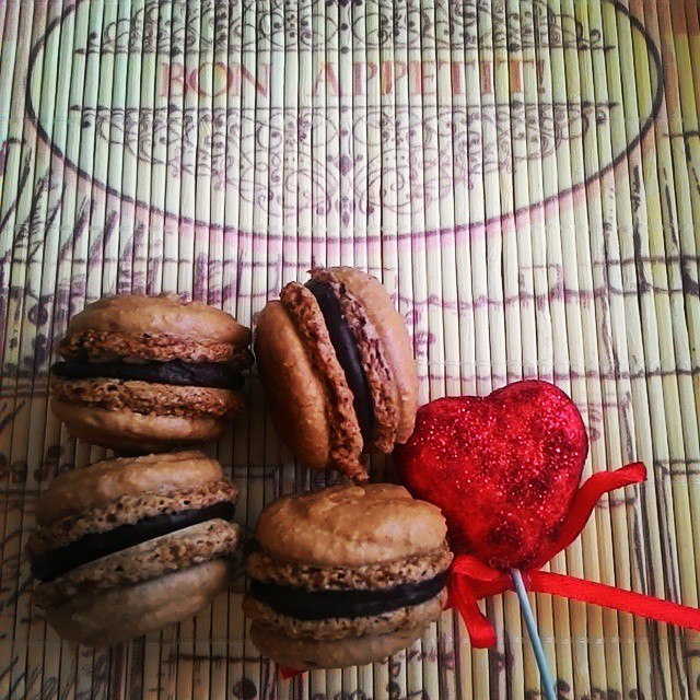 Делала по сайту Нины Тарасовой. Но компановала из разных рецептов. Сами печеньки были "кофейные" по рецепту Луки Монтерсино. Без использования итальянской меренги. Сам процесс не вызвал никаких трудностей, я лишь плохо просеяла миндальную муку, от того в пирожных ощущались ореховые крошки. Плюс, тесто получилось настолько густым, что можно было бы украшать торт, оно бы отлично держало форму. Еще косяк в том, что я их пересушила, а под конец еще и подпалила