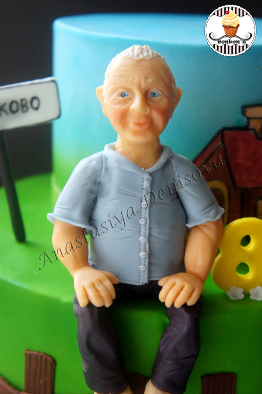 Дедушка у нас любит своих курочек) ну и вообще весь такой традиционный дедушка из деревни) В фотошопе, почему-то(комп тупит или я) не могу вставить фото в картинку с тортом, поэтому так прикреплю здесь...(дедушка слева)