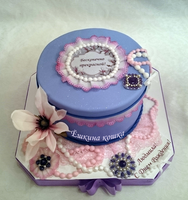 Леночка,ну ооооочаровательный тортик,очень красиво,сочетание цветов ,бусики,брошки...