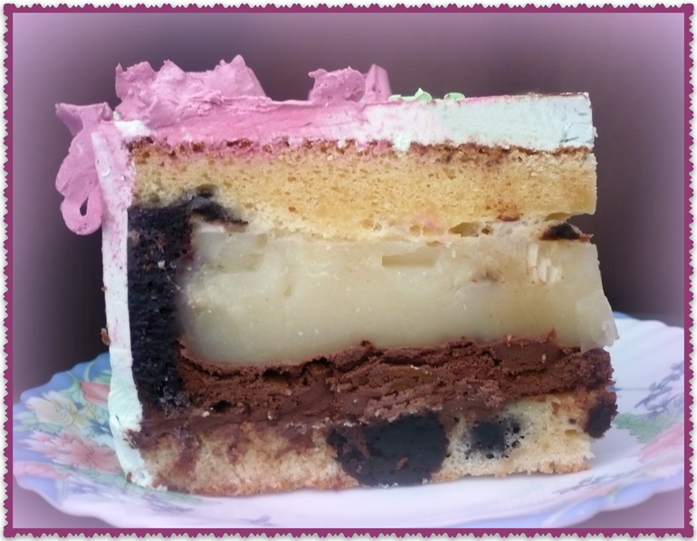 Бисквит на белом шоколаде с шоколадными шариками, шоколад на кипятке, крем на шампанском с ананасами и шоколадный крем с апельсиновым конфи. Вес 2790 г. Получилось очень вкусно!
