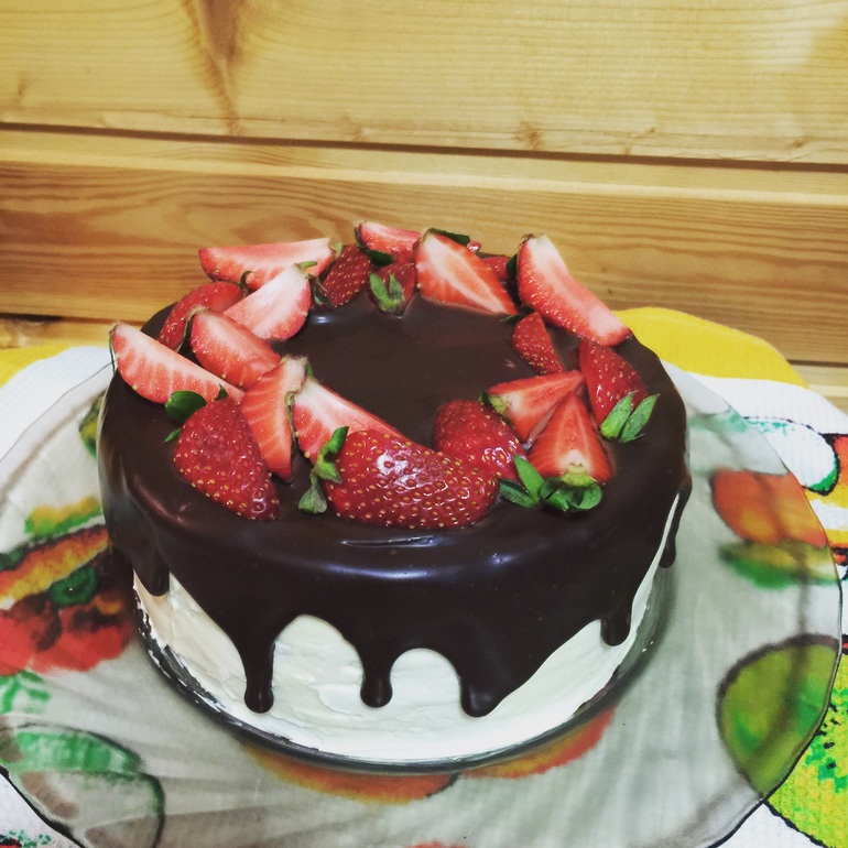 Торты для домашних и друзейПесочный со сливочно-творожным кремом, сверху ганаш и клубника. Вес примерно 1кг.