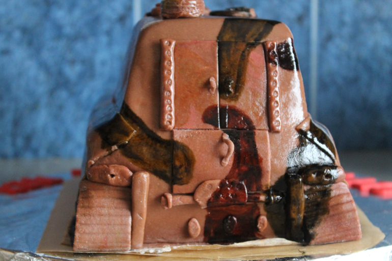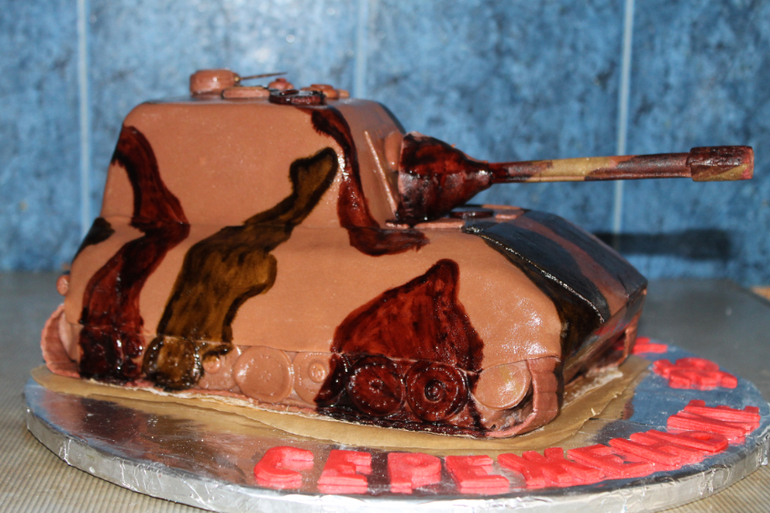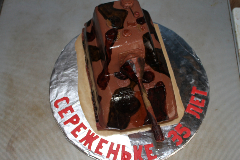 Косяков конечно хоть отбавляй - пропорции, камуфляж - пришлось красками поверх красить, тк ну не получалось по другому. На улице дикая жара была (единственный день кстати), пыталась сделать как тут, но мастика упорно плыла с торта и пришлось несколько раз содрать и заново покрыть ею торт, в итоге тот камуфляж был напрочь испорчен! и разрисовала красками поверх мастики. Ах да и гусеницы у танка не натянуты, как сказал мой папа (служил в танковых), механик-водитель недосмотрел)))