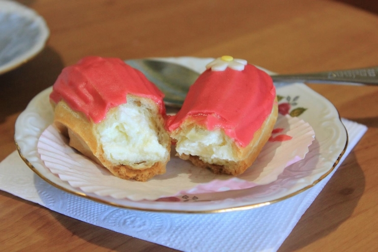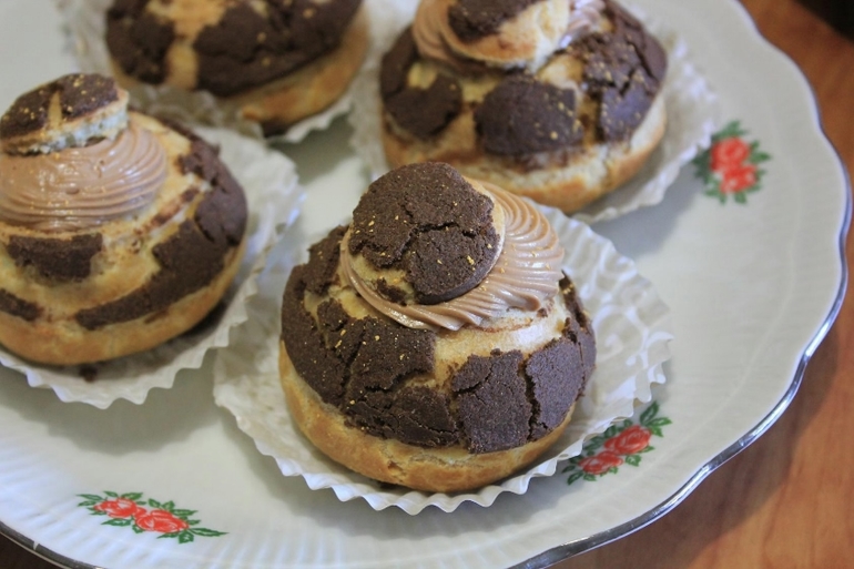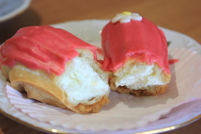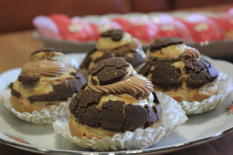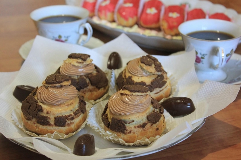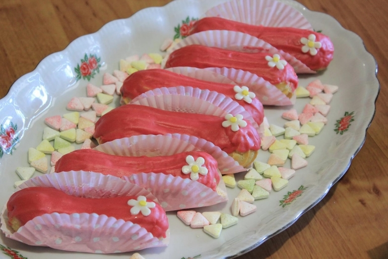 Печенье,пирожные,конфеты, выпечкаЭклеры с ванильным заварным кремом и малиновой глазурью (без красителя))), и пирожные Шу с шоколадным кракелином и шоколадным заварным кремом
