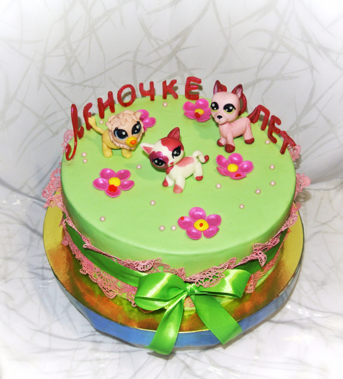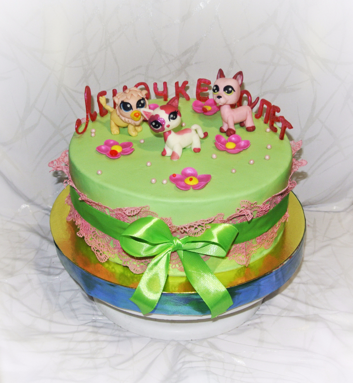 Торты детскиеКошка, собачка и лев из Littlest Pet Shop с карамельными буковками , кружевами, цветочками и бусинками - все как попросила маленькая заказчица.
