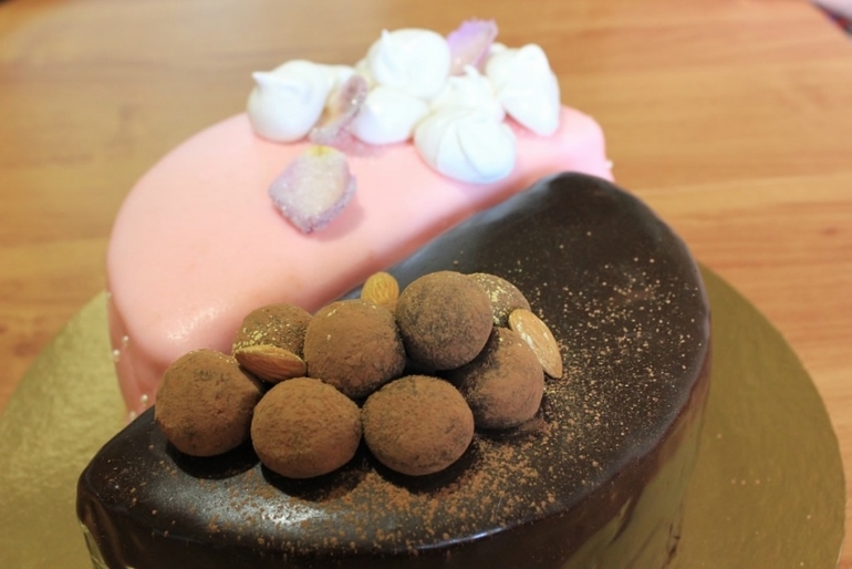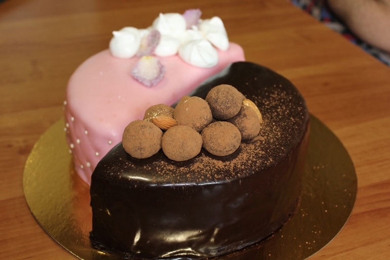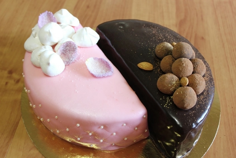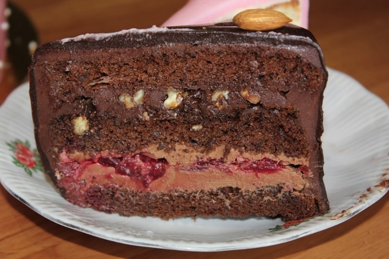 Украшение тортов кремом,шоколадом, фруктамиТортик на совместный день рождения супружеской пары, у которых дни рождения с разницей в 2 дня. Мужской - шифоновый бисквит шоколадный с кофе, заварной крем с горьким шоколадом, вишня, прослойка из шоколадного ганаша с карамелизованными грецкими орехами, сверху - моя первая попытка зеркальной шоколадной глазури, и трюфели. Женский - ванильный бисквит, малиново-ликерная пропитка, мусс клубнично-ежевично-малиновый, покрыт мол.мастикой, меренги и засахаренные лепестки роз. Вес 2900