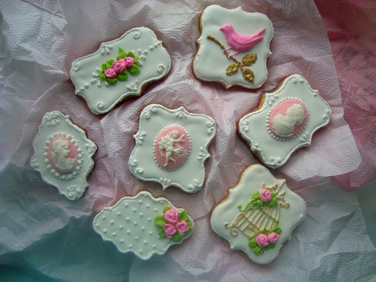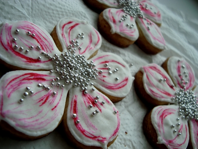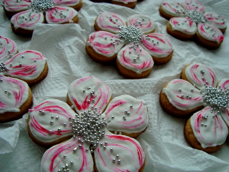Сначала хочу отметить прянички с цветочками, которые с розовыми прожилками =) очень они мне понравились!Можно рискну дать свой небольшой совет? =) Ходила на МК и прянички даже с первого раза получились без бугров. Бугры появляются, когда слишком густой айсинг для заливки... Нужно его чуточку жиже делать.. и хорошенько "поскользить" печенькой по столу.. чтобы все разровнялось. Если хотите, чтобы точки-горошки были как бы единым фоном — то тогда нужно айсинг для заливки делать еще жиже, и очень быстро добавлять "горошки" тоже жидковатым айсингом.. потом опять же "поскользить" и фон станет ровненьким.. и еще, судя по "дрожащему контуру" вы ведете прям конусом (насадки или мешочка) по прянику.. а линию желательно "стелить", выдавливая ее мм на 5 выше поверхности пряника, тогда не будет такого дрожащего контура =)