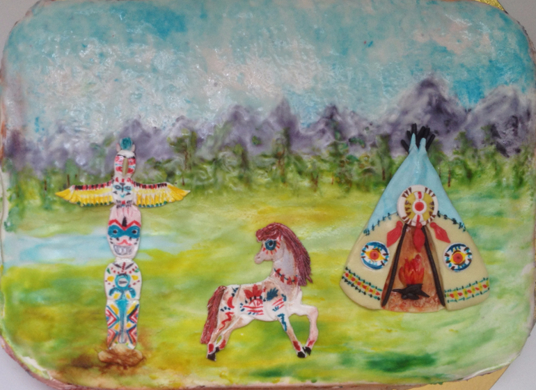 Это была увлекательная работа, жать, что влажность большая мешала развернуться...Тут и тотемный столб(честно пыталась сделать его повеселей) и расписная коняга и вигвам, жители, наверное охотников встречают :)...