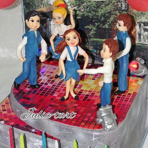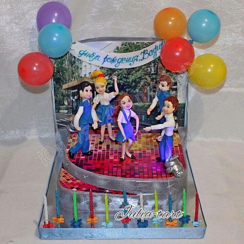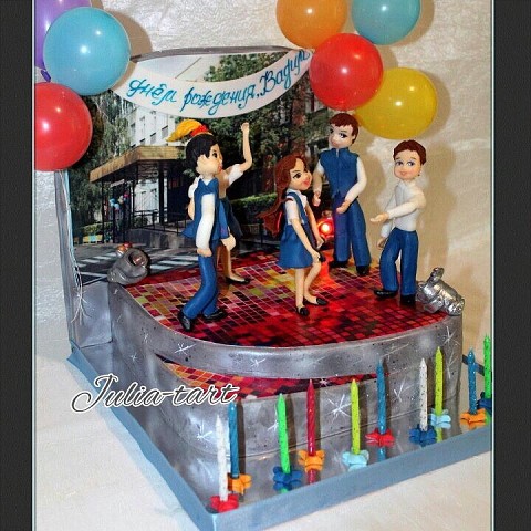 Торты тематическиеТорт на день рождения мальчика , 11 лет. Постаралась выполнить все его пожелания. Как сказала мама, мальчик он творческий и торт хотел обязательно обязательно с школой в шариках и детьми на дискотеке))