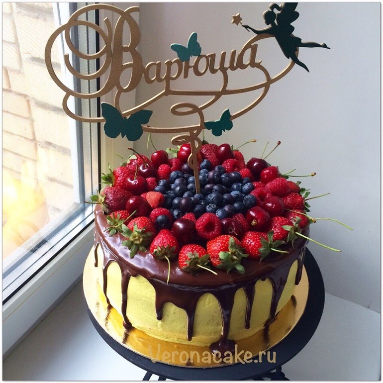 Украшение тортов кремом,шоколадом, фруктами(старшая выбрала другой подарок), внутри творожный мусс с перетертой клубникой и классический бисквит