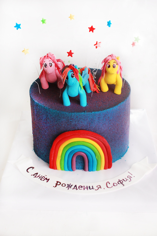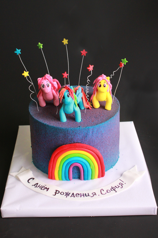 Торты детскиеТортик майл литл пони, покрыт велюром. Начинка - ванильный шифоновый бисквит, клубничный мусс, конфи из вишни и красной смородины, сливочно-творожный мусс с ноткой абрикоса. Покрытие - шоколадный велюр.