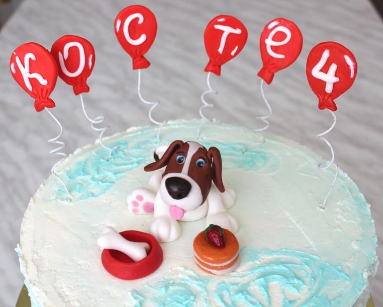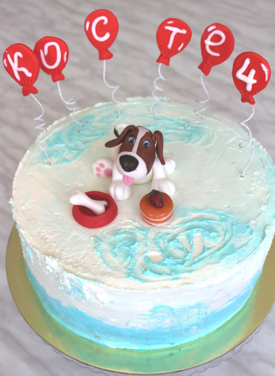 Этот торт был в выходные. Тоже для мальчика, любителя собачек. По сравнению с ежиком теперь мне кажется, что торт пустоват.. Но в 4 утра (когда он доделывался) мне казалось все выглядит очень прилично.. шарики.. торт цвета неба... =)