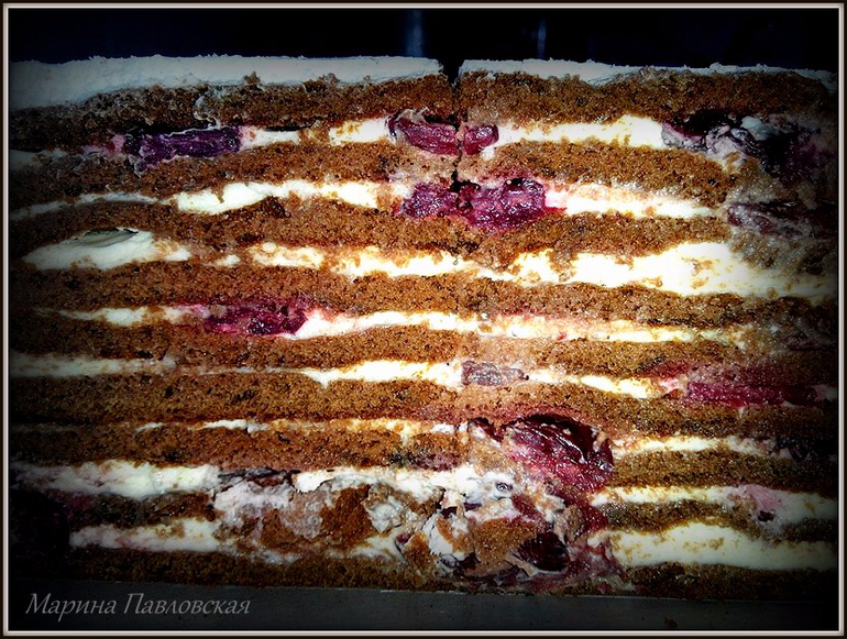 "Каприз". Шоколадные медовые коржи, сливочно-сметанный крем и вишня