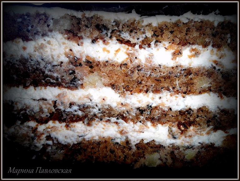Экзотический торт "Колибри" с ананасом, бананом и грецким орехом и со сливочно-маскарпониевым кремом