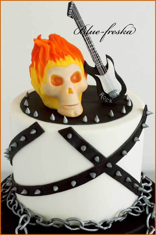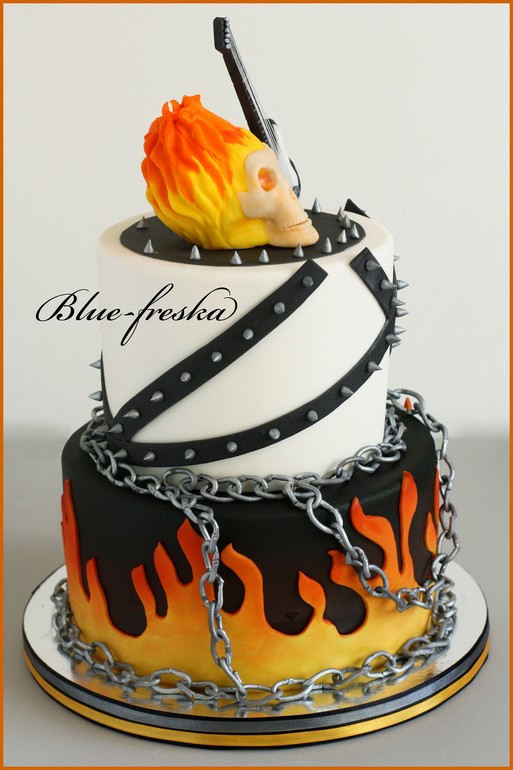 Торты тематическиеЕщё один нетипичный для меня торт, я уже привыкла к ми-ми тортам, но причина совсем безобидная, тортик заказывали на рок вечеринку. Наковала метр цепей, пока думала над черепом, сынок подсуетился и притащил мне голову Призрачного гонщика из своих запасов, так в огне и решено было его лепить.