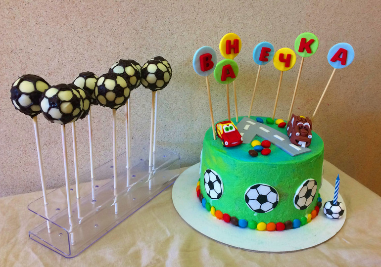 Внутри красный бархат, шоколадный маскарпоне, клубника и голубика. Покрыт кремом с рикотой. Попкейки с красным бархатом и маскарпоне