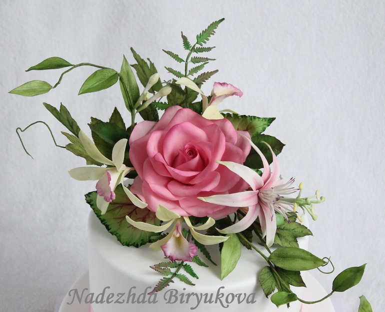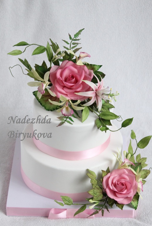 Надя, торт очень нежный, прямо дамский!) А цветочная композиция очень красивая и гармоничная! А можно вопросик или даже два?) Скажите пожалуйста, цветы и зелень собраны вместе тейп-лентой воедино или же все составляющие закреплены на торте по отдельности? И еще, если не секрет, нижняя композиция вставлена в торт или в подложку?